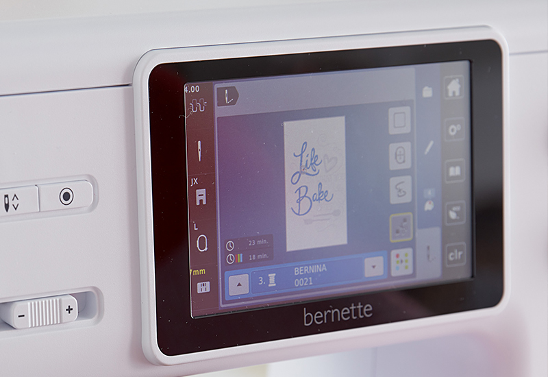 Maszyna i hafciarka Bernette B70 Deco posiada duży ekran dotykowy 5 cali, rozdzielczości HD i kątach widzenia 180 stopni, na którym wybieramy funkcje, ściegi i ustawienia. Czytelny ekran ułatwia wybór i podgląd wzorów, zmianę parametrów haftu oraz edycję projektu bez potrzeby podłączania komputera. Dzięki szerokim kątom widzenia wygodnie kontrolujesz ustawienia nawet stojąc z boku maszyny, co przydaje się podczas pozycjonowania tamborka i pracy z większymi elementami.