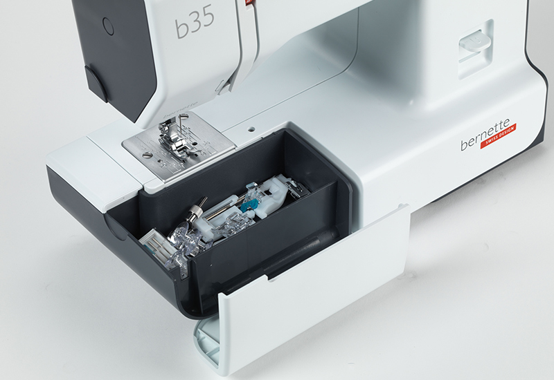 Bernette 35 to mechaniczna maszyna do szycia bez komputerowego sterowania. Szerokość, długość i wzór ściegu można łatwo ustawić, obracając trzy pokrętła. Naprężenie można regulować podczas szycia za pomocą łatwo dostępnego pokrętła. Bernette 35 posiada również automatyczną, 1-stopniową funkcję dziurki na guziki, która jest szybka i łatwa w użyciu. Dzięki 23 ściegom, w tym ściegom użytkowym i dekoracyjnym, można szybko zrealizować swoje kreatywne pomysły. Model bernette 35 jest wyposażony w siedem stopek.