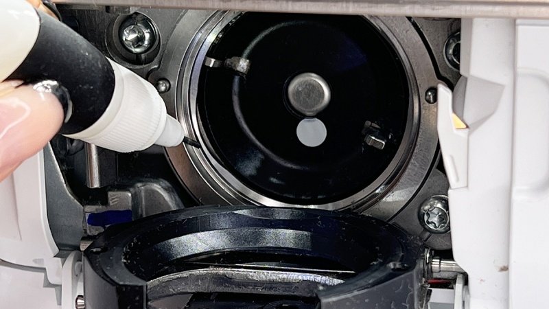 - Następnie podaj kropelkę specjalnego oleju do maszyn lub użyj spray z olejem ( olej spelistyczny do maszyn do szycia można kupić na www.maszynydoszycia.pl . Następnię czystym kawałkiem bawełny wytrzyj do sucha i lekko wypoleruj chwytacz maszyny do szycia.